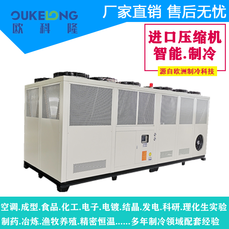 歐科隆150匹風冷螺桿式冷水機是一款工業級大冷量制冷設備,采用高效螺桿壓縮技術,單機冷量達525kW,專為大型工業制程及商業場所設計。機組采用模塊化箱體結構,配備德國比澤爾/漢鐘精機雙螺桿壓縮機,制冷能效比(COP)達3.8以上,溫度控制范圍5~30℃可調。