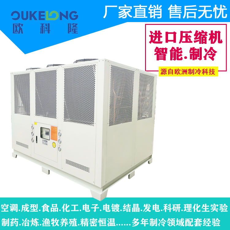歐科隆牌風冷式冷水機之制冷心臟采用全密封低噪音,振動小,高效能省電進口名牌壓縮機,電器控制全部采用進口名牌原件,熱交換器采用殼管式冷凝器,換熱效能高,便于清洗保養。