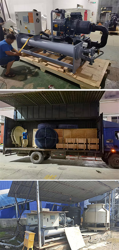 本案為出口到東南亞某國,為注塑廠中央供水系統冷水機組案例。采用兩套60匹水冷螺桿式冷水機組,制作精良,品質優異深受用戶好評。