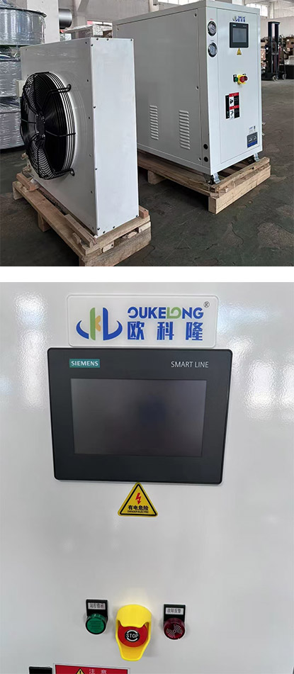 本案例位于華中科技大學物理實驗室使用高階定制冷水機,特點:控制器為西門子程序控制、流量溫度壓力PLC變頻可調、內外機分體設計,內機在實驗設備旁邊,外機在外墻上方便通風散熱。